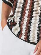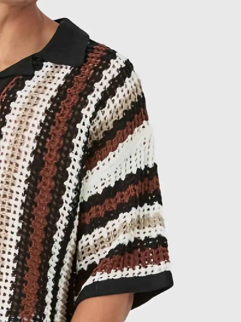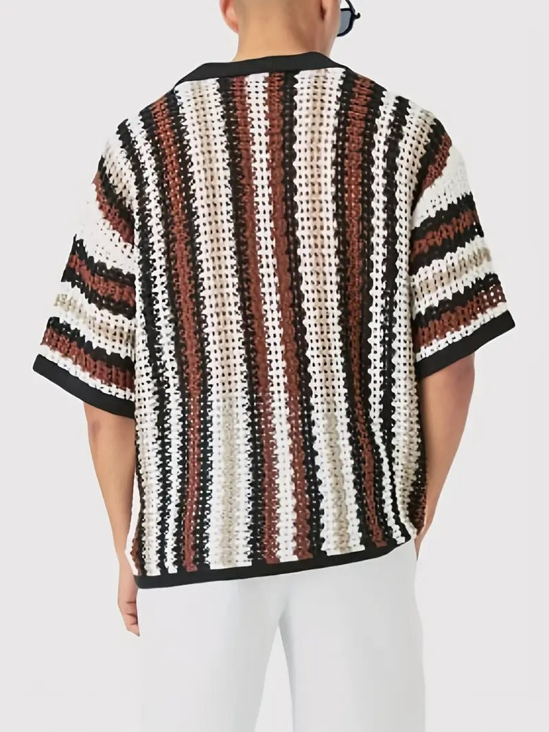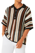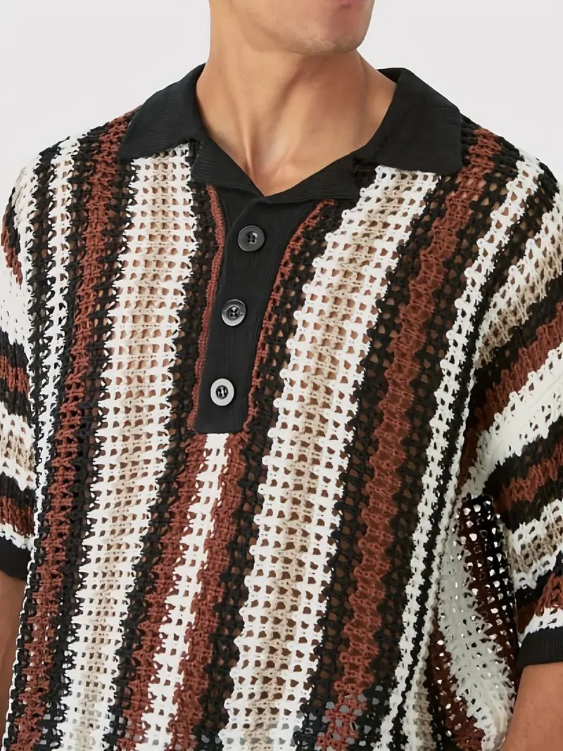 Cette chemise en maille rayée pour homme présente un motif à rayures verticales. La maille ouverte lui confère une texture proche du crochet. Elle est dotée d’un col polo contrastant et d’une patte de boutonnage à trois boutons. Des finitions côtelées sont placées aux manches et à l’ourlet.