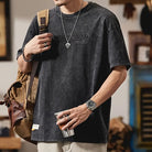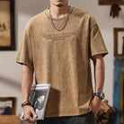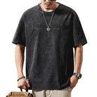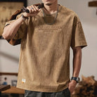 Ce T-shirt pour homme présente une finition délavée et un grand imprimé sur la poitrine. Juste en dessous, une phrase plus petite est inscrite. Le T-shirt possède un col rond avec bord-côte et des manches courtes avec des coutures d’épaules tombantes.