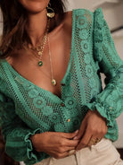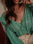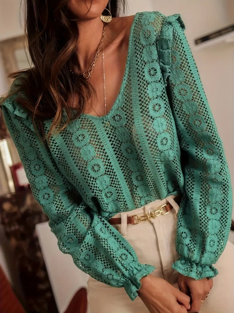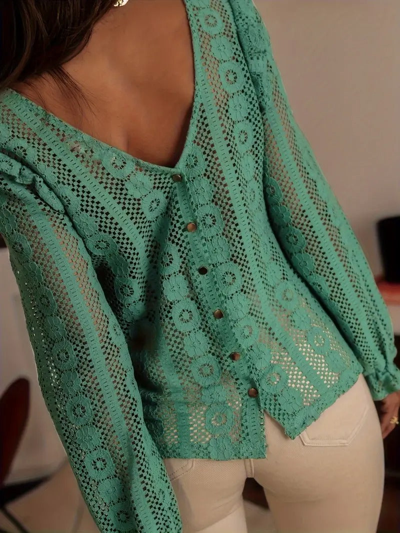 Cette chemise pour femme présente un col en V et des manches longues. Les poignets et les épaules sont ornés de volants. De petits boutons ronds sont placés sur le devant. La chemise est fabriquée en dentelle avec un motif floral sur toute la surface.
