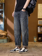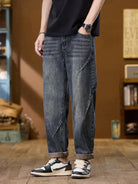 Ce jean pour homme est en denim délavé. Il présente une taille mi-haute avec une fermeture éclair. La coupe droite offre une largeur constante de la cuisse à l’ourlet. Le jean dispose de deux poches avant et deux poches arrière.