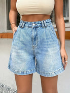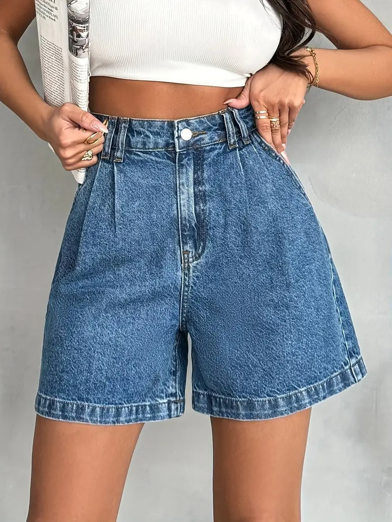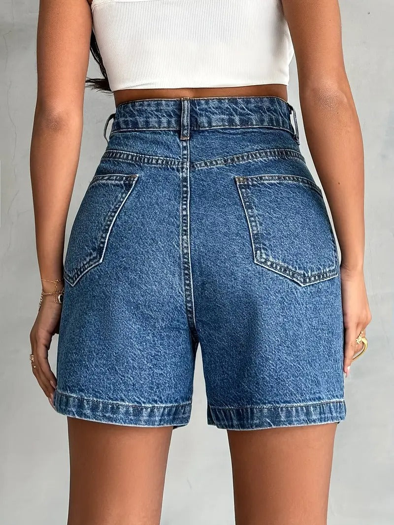 Ces shorts en denim pour femme présentent une coupe à jambe droite et une taille haute. La ceinture est équipée d’une fermeture par bouton et glissière avec des passants pour ceinture pour un usage optionnel. Deux poches avant et deux poches arrière offrent un espace de rangement. Les shorts s’arrêtent au-dessus du genou.