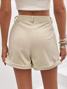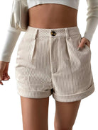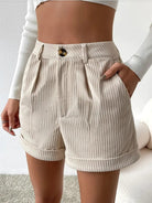 Ces shorts taille haute pour femme présentent une texture à rayures verticales. Ils possèdent une taille haute avec fermeture par bouton à l’avant et des passants pour ceinture à la taille. Des poches latérales sont placées des deux côtés pour le rangement. Les ourlets sont repliés et les shorts s’arrêtent au-dessus du genou.