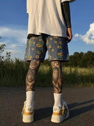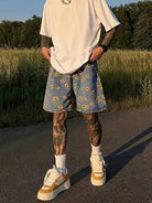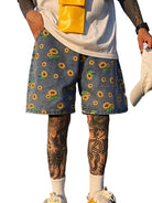 Ce short en denim pour homme présente un imprimé tournesol sur l’ensemble du vêtement. Il a une coupe droite et s’arrête au-dessus du genou. Deux poches avant sur les hanches offrent un espace pour de petits objets.